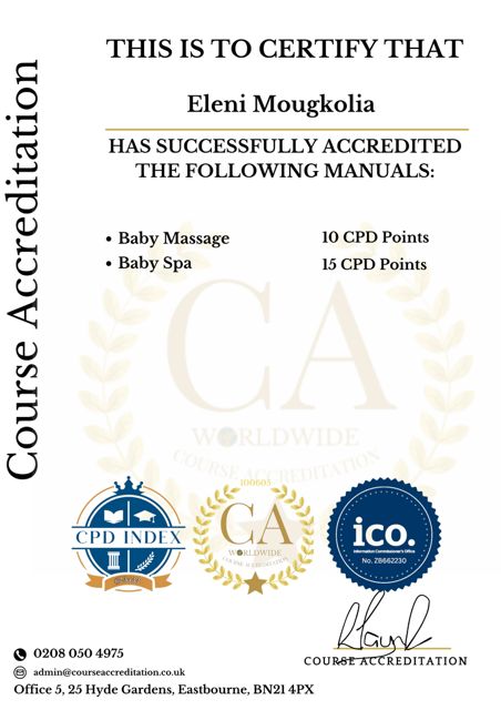 Τα σεμινάρια αισθητικής που θα παρακολουθήσετε είναι πιστοποιημένα από τον παγκοσμίως αναγνωρισμένο Φορέα Πιστοποίησης Course Accreditation, με έδρα το Λονδίνο. Η πιστοποίηση έχει γίνει με αύξοντα αριθμό μητρώου 100605, και το συγκεκριμένο πρόγραμμα παρέχει 30 CPD Points.